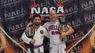 Daniel Ladero (dch.) posa orgulloso junto a su discípulo José Santana, con sus cinturones de campeones del NAGA. / LP/DLP