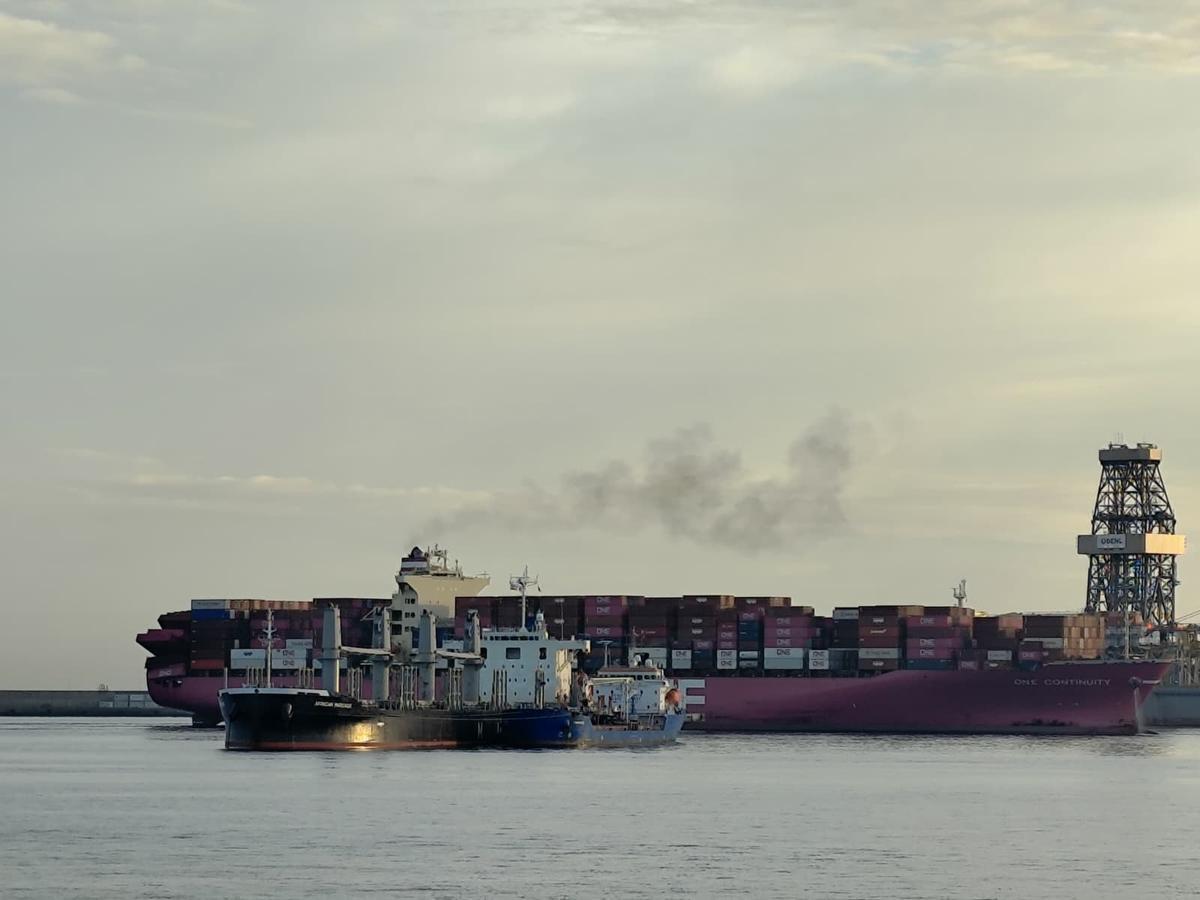 El 'One Continuity' entra en La Luz con parte de los contenedores que carga a punto de caer al mar