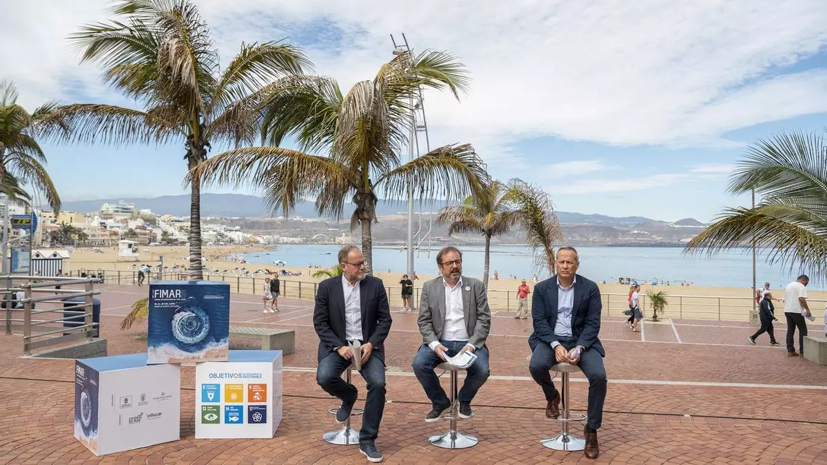 Raúl García Brink, coordinador técnico de Desarrollo Económico, Soberanía Energética, Clima y Conocimiento del Cabildo de Gran Canaria; José Eduardo Ramírez, concejal de Ciudad de Mar del Ayuntamiento de Las Palmas de Gran Canaria; y Francisco Trujillo, director de la Autoridad Portuaria de Las Palmas, procedieron en la mañana de este 6 de junio a la presentación del programa de FIMAR 2023, en un acto que tuvo lugar en la Plaza de Saulo Torón, en el Paseo de Las Canteras.