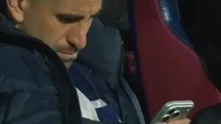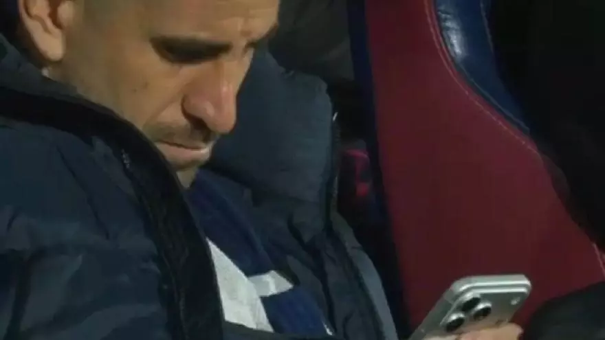 Dani Ojeda, con el móvil en el banquillo, el pasado miércoles. | / LALIGA TV
